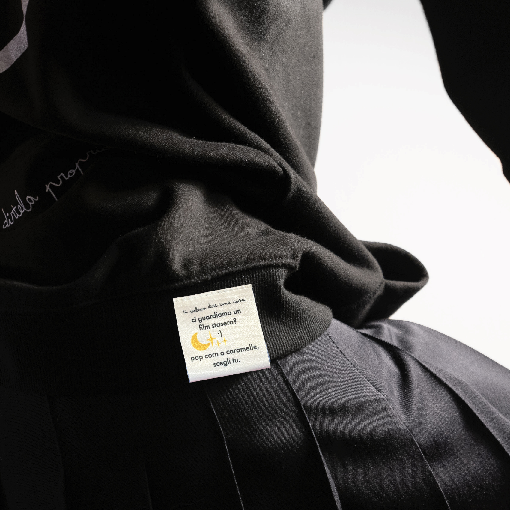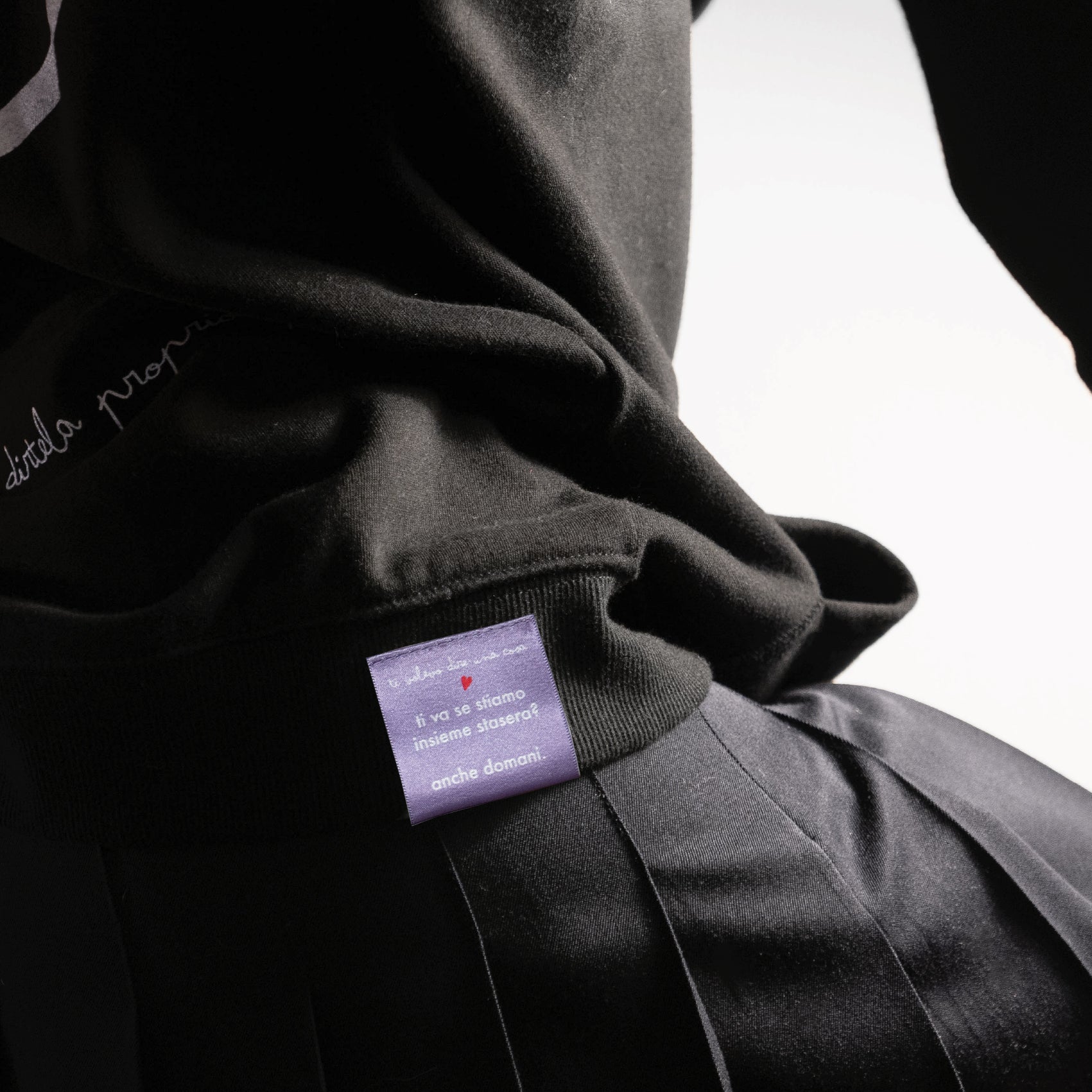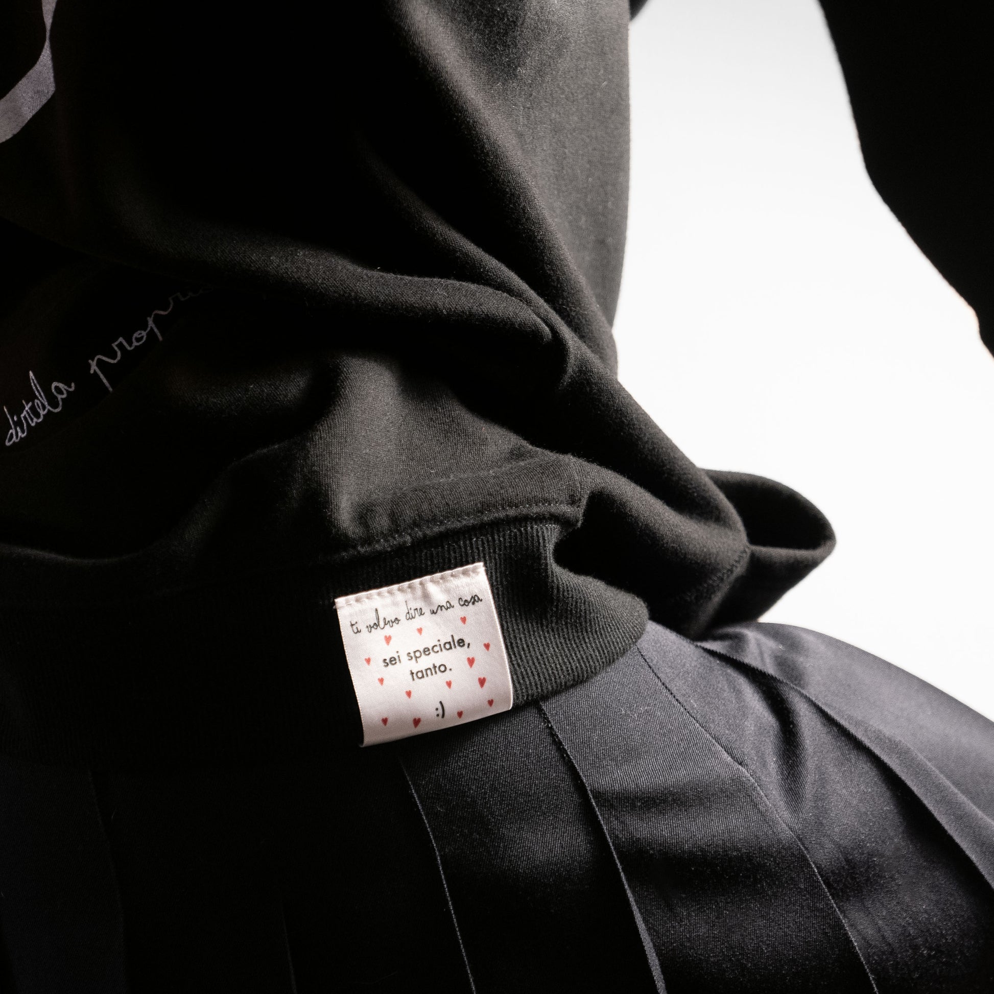 Felpa loose fit, con etichetta personalizzata ricamata in basso a destra sul retro.