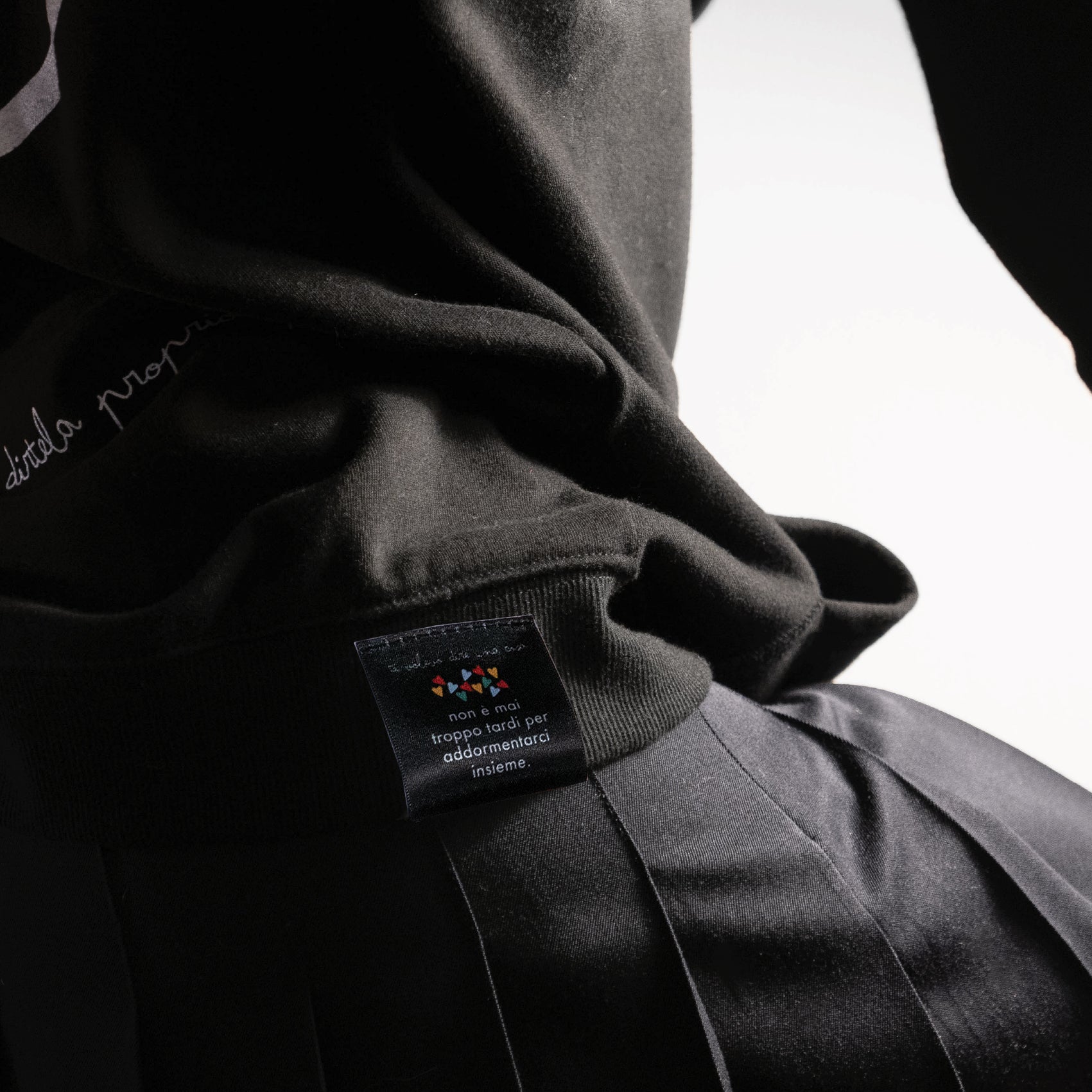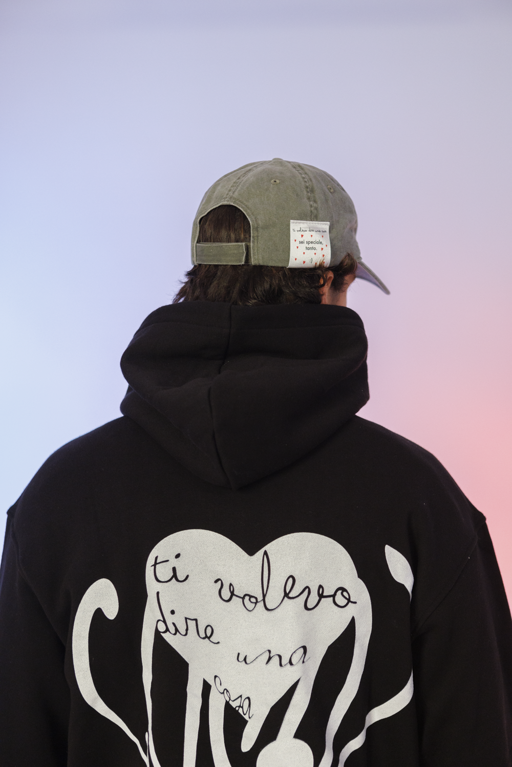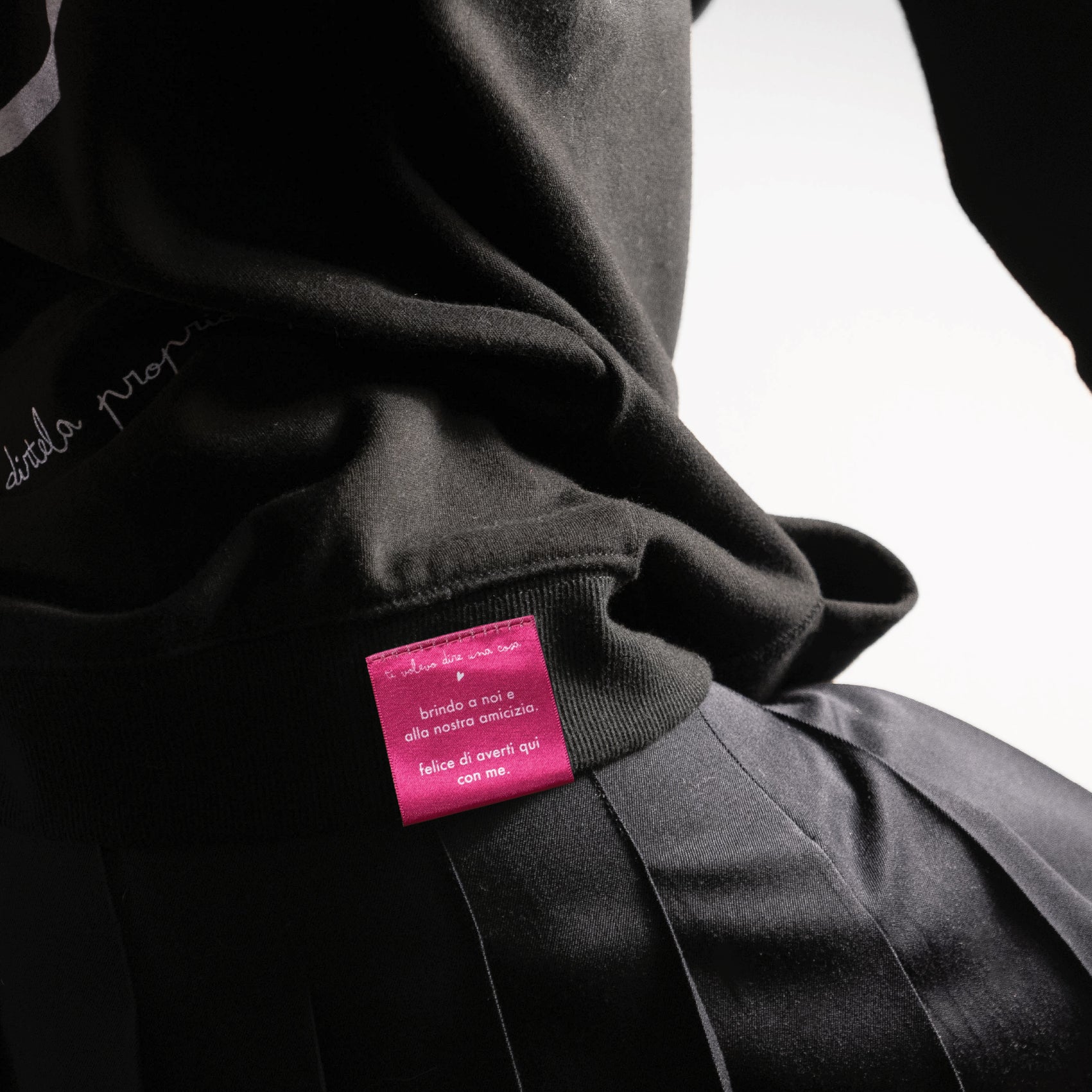 Felpa loose fit, con etichetta personalizzata ricamata in basso a destra sul retro.