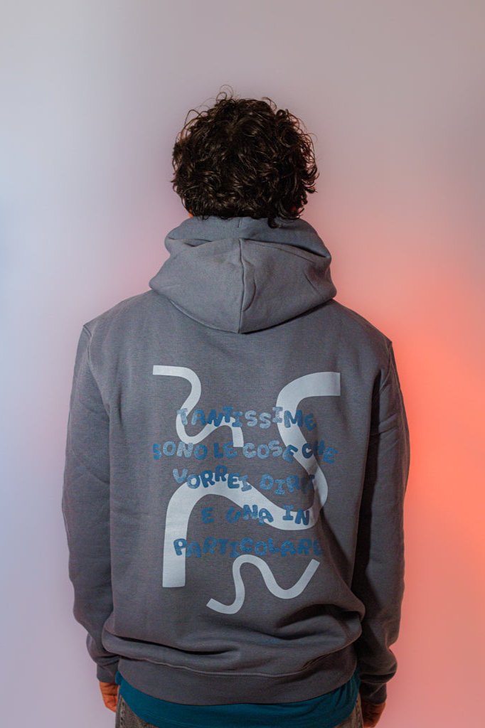 Hoodie con tasca a canguro e cappuccio con etichetta personalizzata ricamata sul retro in basso, e stampa sul retro in alto.