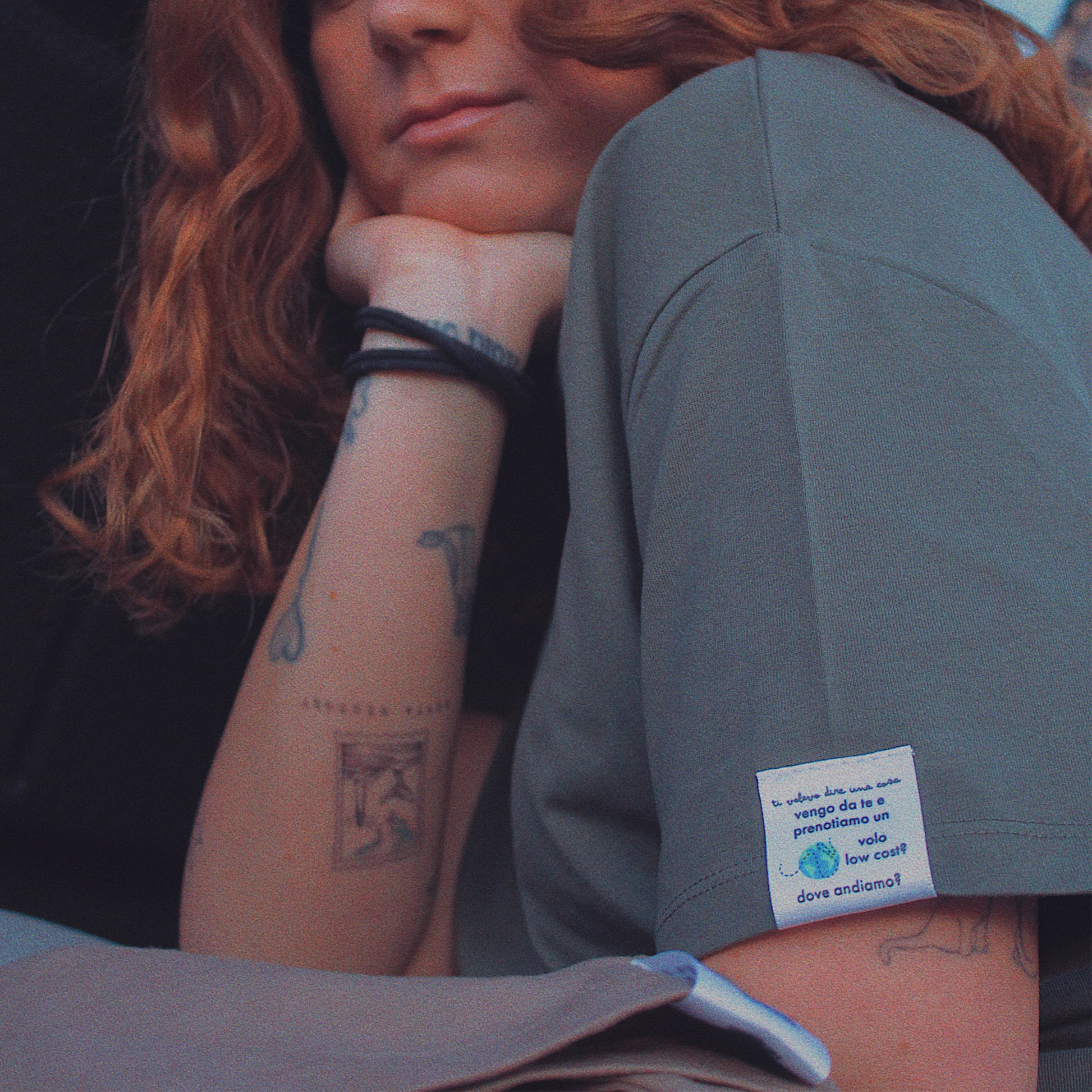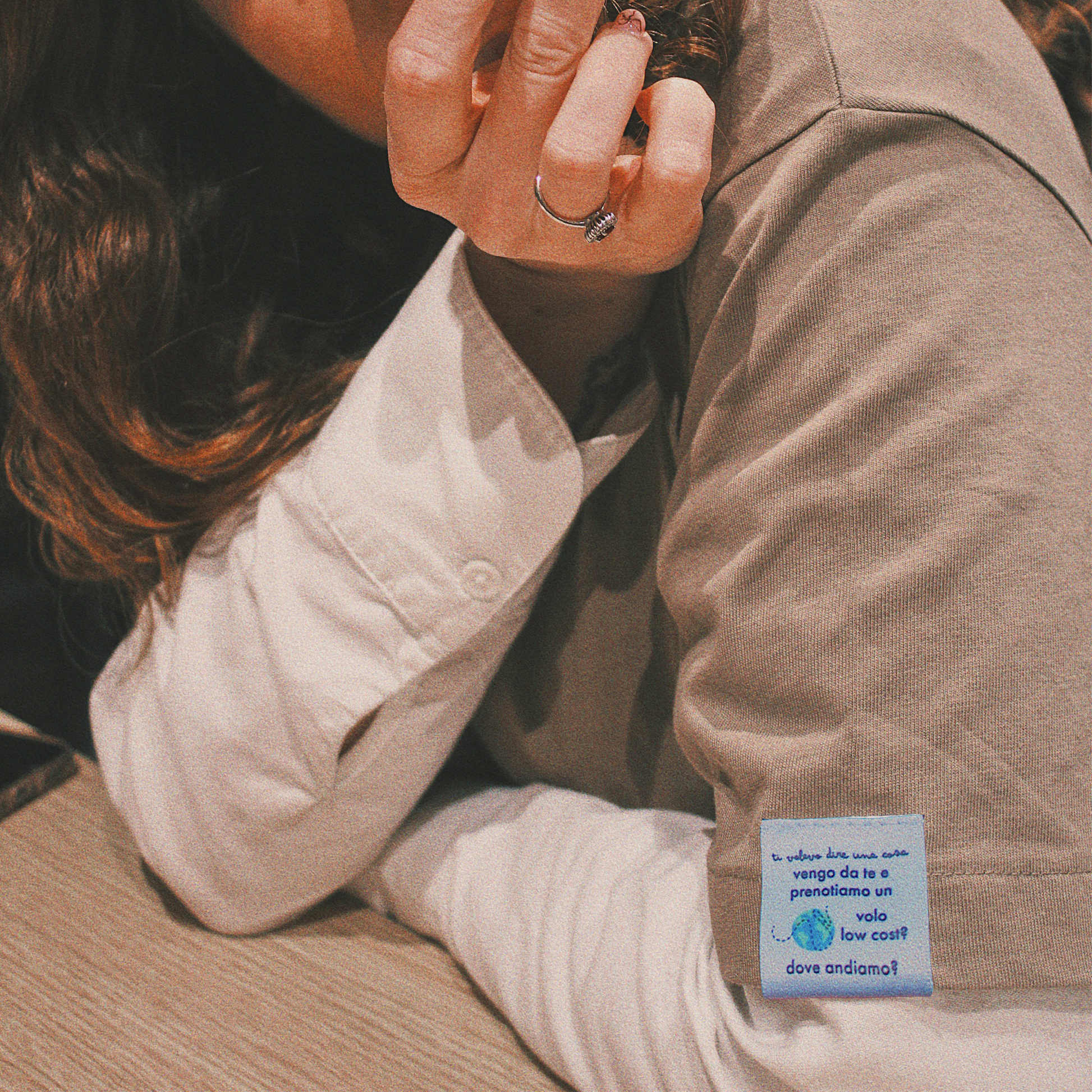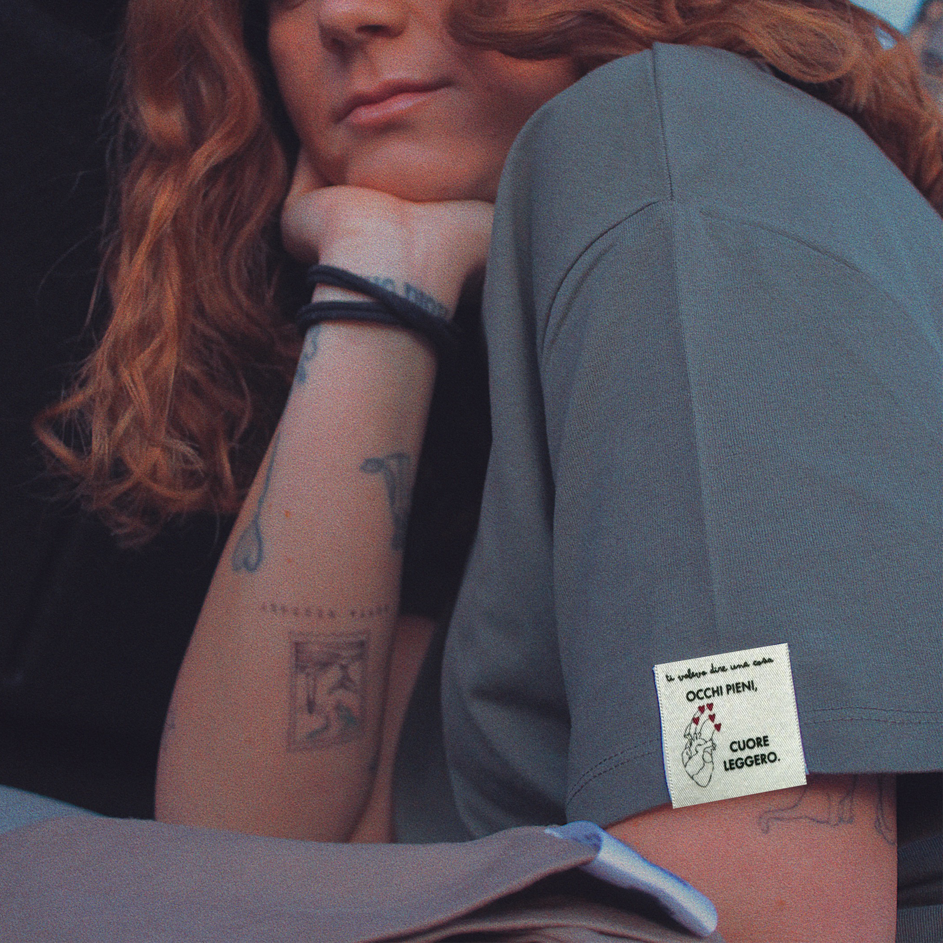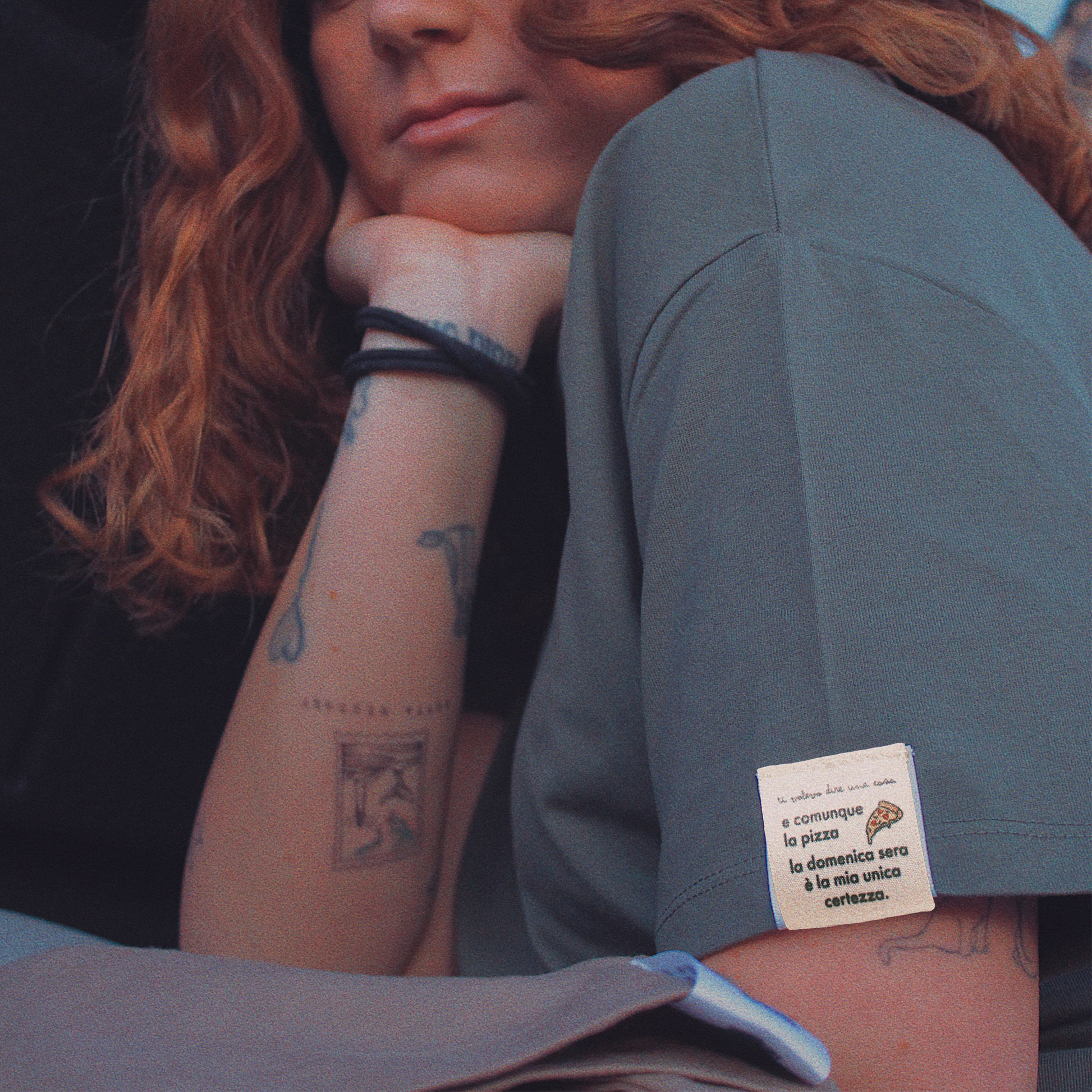 T-shirt 100% con etichetta personalizzata ricamata su manica sinistra, e stampa sul fronte.